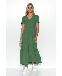Długa dopasowana sukienka wykonana z elastycznej dzianiny wiskozowej. Posiada okrągły dekolt oraz krótki rękaw. Po boku widać marszczenie, które perfekcyjnie podkreśla kobiece biodra. Efekt został wzbogacony o rozcięcie w dolnej części oraz uroczą złotą blaszkę na zakończeniu marszczenia. Z pozoru casualowa sukienka, sprawdzi się podczas eleganckiej kolacji czy uroczystej imprezy w towarzystwie szampana. To bezbłędne połączenie szyku i wygody. Załóż do niej wysokie szpilki, ulubioną biżuterię i olśniewaj. Sukienka występuje w kolorach: czarny, beżowy, khaki.