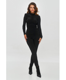 Szykowny czarny komplet o eleganckim, dopasowanym kroju. Bluzka ma długie rękawy i wysoki dekolt, co nadaje całości wyrafinowany i opływowy wygląd. Przechodzący szew wzdłuż przodu i tyłu tworzy marszczenia co dodaje faktury i efektownie modeluje sylwetkę. Nogawki spodni są zwężane, podkreślając dopasowany wygląd i nowoczesny styl. Gładki materiał z lekkim połyskiem nadaje blasku i pasuje zawsze i wszędzie. Krój tego modelu akcentuje talię i dodaje zmysłowości całej kreacji. Komplet damski dopasowany do kształtu sylwetki wydobędzie najgłębiej skrywane pokłady seksapilu i pewności siebie. Doskonały dla odważnych kobiet i prawdziwych fashionistek.