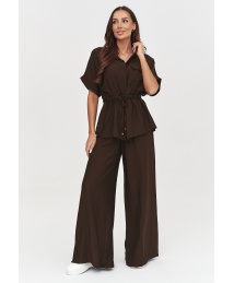 Komplet damski składający się z luźnej bluzki oraz szerokich spodni to idealna propozycja dla kobiet ceniących komfort i elegancję. Bluzka z krótkim rękawem oraz ściągaczem w talii pięknie podkreśla sylwetkę, jednocześnie zapewniając swobodę ruchów. Spodnie o szerokiej nogawce dodają lekkości i nowoczesnego charakteru stylizacji. Ten modny zestaw damski świetnie sprawdzi się zarówno na co dzień, jak i podczas bardziej formalnych okazji. Wykonany z przyjemnego w dotyku materiału, gwarantuje wysoki komfort noszenia przez cały dzień. To doskonały wybór dla kobiet poszukujących uniwersalnej stylizacji, która łączy w sobie minimalizm, wygodę i ponadczasowy design.
