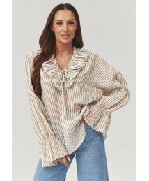 Stylowa bluzka damska o luźnym kroju to idealne połączenie kobiecej elegancji i codziennego komfortu. Model wyróżnia się efektowną falbaną przy dekolcie oraz delikatnym wiązaniem, które subtelnie podkreśla szyję i linię biustu. Pionowe paski optycznie wysmuklają sylwetkę, a lekko rozszerzane rękawy dodają całości lekkości i modnego charakteru. Bluzka dostępna jest w trzech ponadczasowych kolorach: beżowym, różowym oraz błękitnym, dzięki czemu z łatwością dopasujesz ją do swojego stylu i garderoby. Doskonale sprawdzi się zarówno w stylizacjach casualowych z jeansami, jak i w bardziej eleganckim wydaniu – do spodni materiałowych lub spódnicy. To propozycja idealna na co dzień, do pracy, na spotkanie czy wyjście z przyjaciółmi. Lekki, przyjemny w dotyku materiał zapewnia komfort noszenia przez cały dzień.