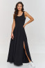 Ta sukienka maxi to połączenie elegancji i wygody, idealna na wiosenne i letnie dni. Wykonana z przyjemnej wiskozy, która zapewnia oddychalność i komfort podczas noszenia. Sukienka ma głęboki dekolt, który podkreśla górną część sylwetki a szerokie ramiączka gwarantują uniwersalność i modny wygląd. Długość maxi optycznie wydłuża sylwetkę a delikatne zakładki, zapewniają lekkość i płynność ruchów nadając sukience dynamiczny a zarazem elegancki charakter. Subtelne rozcięcie z boku wprowadza element zmysłowości i kobiecości. Dzięki niemu sukienka jest wygodna w noszeniu i pozwala na swobodę poruszania się. Sukienka maxi z rozcięciem to synonim klasy i stylu, która sprawdzi się zarówno w stylizacjach casualowych jak i bardziej formalnych w zależności jakie dobierzesz do niej dodatki. Model zaprojektowany w kilku kolorach: czarny, jasny beż, błękitny i oliwkowy.