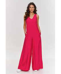 Stylowy kombinezon to świetna propozycja dla kobiet szukających modowego outfitu. Model ma subtelny dekolt w kształcie litery V, który nadaje mu eleganckiego i kobiecego wyglądu oraz dodatkowo podkreśla sylwetkę i optycznie wydłuża szyję, dodając klasy i lekkości. Szerokie nogawki oraz luźny fason sprawiają, że kombinezon jest bardzo wygodny i jednocześnie oryginalny. Model jest zapinany na zamek co ułatwia jego zakładanie, natomiast boczne kieszenie stanowią praktyczny dodatek. Dodatkowym jego atutem jest przyjemny w dotyku i przewiewny materiał co czyni go doskonałą propozycją na ciepłe dni. Dzięki prostemu, ale efektownemu fasonowi, kombinezon nadaje się zarówno na codzienne wyjścia, jak i na bardziej formalne okazje, takie jak spotkania czy wieczorne wyjścia. Można go połączyć z białymi sneakersami na co dzień lub z szpilkami na bardziej eleganckie wydarzenia. Została zaprojektowany w pięciu kolorach: jasny beż, czarny, mokka, malinowy i blue jeans.