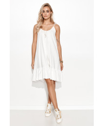 Długa sukienka asymetryczna uszyta z dzianiny dresowej. Posiada okrągły dekolt, w talii ma umieszczoną gumę ściągającą. Tył sukienki jest nieco dłuższy od przodu, dzięki czemu casualowa kreacja ciekawie prezentuje się na sylwetce. Prawie na całej długości sukienka posiada delikatne drapowania. Po bokach zostały wszyte boczne kieszenie wsuwane. Okrągły dekolt pozostawia przestrzeń na piękny łańcuszek. Z kolei krótkie rękawy maskują ramiączka od bielizny. Załóż do niej ulubione botki lub sandały i ciesz się swobodą, zadając przy okazji szyku. Sukienka występuje w kolorach: blue jeans, zielony, czarny, pudrowy róż, mokka, piaskowy.