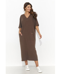 Gara, brīva piegriezuma kleita ar īsām piedurknēm un V veida kakla izgriezumu, kas lieliski apvieno komfortu ar klasisku ikdienas eleganci. Kleitai ir divas praktiskas kabatas priekšpusē, un pie vienas no tām ir papildu akcents – zelta plāksnīte, kas piešķir tai smalku mirdzumu. Vienkārša un eleganta, šī kleita ir ideāla izvēle ikdienai, nodrošinot komfortu un mūžīgu stilu. Pieejama melnā, šokolādes, haki, gaiši bēšā un mokas krāsās, ļaujot pielāgot toni individuālajām vēlmēm. Izveidojiet ar to universālu tēlu dažādiem gadījumiem. Tas ir apģērbs, kas uzsvērs jūsu personību un piešķirs pārliecību. Ideāli sader ar plakanām sandalēm vai espadrillēm.