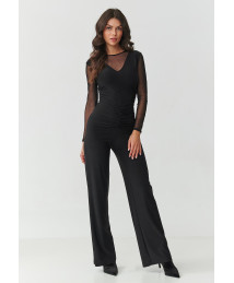 Ten wyjątkowy czarny kombinezon damski to kwintesencja nowoczesnej elegancji. Zaprojektowany z myślą o kobietach, które cenią sobie wygodę, ale nie chcą rezygnować z szyku i klasy, sprawdzi się idealnie na wieczorne wyjście, koktajl party czy elegancką kolację. Góra kombinezonu zachwyca subtelnymi wstawkami z tiulu – długie, półprzezroczyste rękawy i dekolt w kształcie litery V nadają całości lekkości i zmysłowości, jednocześnie pozostając eleganckie i stylowe. Dopasowany krój w talii pięknie podkreśla sylwetkę, a szerokie, proste nogawki dodają całości charakteru i optycznie wydłużają nogi. Zapinany na zamek z tyłu, kombinezon gwarantuje wygodę noszenia oraz idealne dopasowanie do figury. To idealna propozycja dla kobiet, które chcą wyróżnić się w tłumie, wybierając stylową alternatywę dla sukienki wieczorowej.