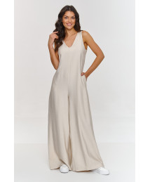 Stilīgs kombinezons ir lielisks piedāvājums sievietēm, kuras meklē modernu apģērbu. Modelim ir smalks V veida dekoltē, kas piešķir tam elegantisku un sievišķīgu izskatu, kā arī papildus izceļ figūru un optiski pagarina kaklu, piešķirot klasi un vieglumu. Platās staras un brīvais piegriezums padara kombinezonu ļoti ērtu un vienlaikus oriģinālu. Modelis ir aizdarāms ar rāvējslēdzēju, kas atvieglo tā uzvilkšanu, savukārt sānu kabatas ir praktisks papildinājums. Tā papildu priekšrocība ir patīkams pieskārienam un gaisīgs materiāls, kas padara to par lielisku izvēli siltām dienām. Pateicoties vienkāršajam, bet efektīvajam piegriezumam, kombinezons ir piemērots gan ikdienas izbraukumiem, gan formālākām reizēm, piemēram, tikšanām vai vakara pasākumiem. To var kombinēt ar baltiem sporta apaviem ikdienā vai ar augstpapēžu kurpēm elegantākiem pasākumiem. Tas ir pieejams piecās krāsās: gaiši bēšs, melns, mokas, aveņu un džinsa zils.