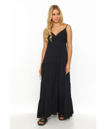 Długa letnia suknia, podzielona na segmenty imitujące subtelne falbany, to kwintesencja lekkości i romantyzmu. Sukienka, wiązana na cienkich sznurkach, dodaje wyjątkowej delikatności i swobody ruchów. Przekładany dekolt w serek subtelnie podkreśla biust, dodając kreacji kobiecego uroku. Ozdobna złota blaszka wszyta z tyłu dodaje sukience elegancji i wyjątkowego blasku. Letnia kreacja występuje w różnorodnych kolorach, w odcieniach: mokka, jasnego beżu, czekoladowego i czarnego, co pozwala na dopasowanie do indywidualnych preferencji i stylu.