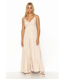 Długa letnia suknia, podzielona na segmenty imitujące subtelne falbany, to kwintesencja lekkości i romantyzmu. Sukienka, wiązana na cienkich sznurkach, dodaje wyjątkowej delikatności i swobody ruchów. Przekładany dekolt w serek subtelnie podkreśla biust, dodając kreacji kobiecego uroku. Ozdobna złota blaszka wszyta z tyłu dodaje sukience elegancji i wyjątkowego blasku. Letnia kreacja występuje w różnorodnych kolorach, w odcieniach: mokka, jasnego beżu, czekoladowego i czarnego, co pozwala na dopasowanie do indywidualnych preferencji i stylu.