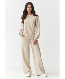 Izvēlies sieviešu sporta komplektu, kas apvieno ērtumu un modernu izskatu. Tas ir piemērots gan ikdienai, gan atpūtai mājās vai izejot ārpus mājas. Izgatavots no mīksta, elpojoša auduma. Sastāvs: 95% kokvilna, 5% elastāns. Nodrošina ērtu valkāšanu un labu piegulšanu, neierobežojot kustības. Komplekta augšdaļa ir klasiska blūze ar apaļu dekoltē un nedaudz pazeminātu plecu līniju. Tai ir viegls oversize piegriezums, kas piešķir tēlam brīvību un mūsdienīgu raksturu. Tās īpašo izskatu akcentē izšūts logo priekšpusē, kas piešķir oriģinalitāti un smalku stilu. Bikses izceļas ar modernu piegriezumu ar platām starām, kas skaisti krīt kustībā un piešķir siluetam vieglumu, kā arī līdzsvaro proporcijas. Elastīga jostasvieta un praktiskas kabatas palielina funkcionalitāti un valkāšanas ērtumu.