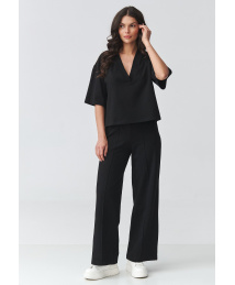 Stilīgs sieviešu komplekts ar platām biksēm ir ideāla ērtuma un modernas elegances kombinācija. Komplekts sastāv no brīvas blūzes ar V veida kakla izgriezumu un platām biksēm, kas skaisti pagarina siluetu un piešķir tēlam vieglumu. Šis elegantais sieviešu komplekts būs piemērots gan ikdienai, gan formālākām reizēm. Tā ir lieliska izvēle darbam, tikšanās reizēm, pastaigām vai ceļojumiem. Minimālistiskais fasons ļauj veidot dažādus stilus – sportisku variantu ar kedām vai elegantāku ar smalkiem apaviem. Brīva piegriezuma blūze nodrošina valkāšanas komfortu un smalki izceļ kakla izgriezuma līniju, savukārt platās sieviešu bikses garantē ērtumu un modernu, mūžīgu izskatu. Kopumā tas veido saskaņotu ikdienas sieviešu komplektu, kas apvieno brīvību ar eleganci.