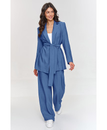 Ten damski komplet został zaprojektowany z myślą o kobietach, które szukają połączenia stylu, wygody i nowoczesnej elegancji. Marynarka o dłuższym luźnym kroju, nadaje stylizacji nowoczesny charakter a wiązany pasek pozwala na dopasowanie do sylwetki podkreślając linię talii. Nie posiada podszewki co czyni ją lżejszą i swobodniejszą. Spodnie o szerokich nogawkach podkreślają modny wygląd a elastyczny pas zapewnia maksymalny komfort. Model wykonany z lekkiego, strukturalnego materiału, który akcentuje jego wyjątkowość i klasę. Dodatkowym plusem jest możliwość rozkompletowania, dzięki czemu możesz każdy element nosić oddzielnie tworząc różnorodne i oryginalne outfity. Dzięki prostej ale efektownej konstrukcji komplet jest doskonałym rozwiązaniem zarówno na wypady ze znajomymi jak i do biura, na spotkania biznesowe i inne formalne wyjścia gdzie chcesz wyglądać profesjonalnie jednocześnie nie rezygnując z wygody. Zaprojektowany w kilku wariantach kolorystycznych: blue jeans, czarny, jasny beż, malinowy i mokka.