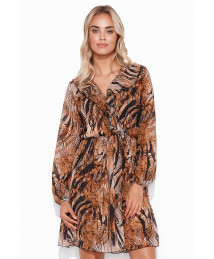 Piękna i niezwykle kobieca sukienka maxi z golfem, uszyta z siatki. Model dostępny w czterech wersjach, różniących się między sobą wzorem i kolorem. Sukienka posiada długi rękaw. Jest dopasowana w górnej części. Z tego względu doskonale podkreśla biust. Na linii talii jest podszyta cienkim szwem ozdobionym subtelną blaszką. Dolna część sukienki jest zwiewna, lekko drapowana. Uszyta z dwóch części: długiej wierzchniej oraz halki przed kolano. Dzięki temu miejsca intymne są dobrze zakryte, natomiast przy rękach i nogach materiał jest lekko transparentny, co nadaje kreacji lekkości.