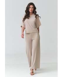 Ten komplet damski to idealne połączenie komfortu i nowoczesnego stylu. Zestaw składa się z luźnej bluzki damskiej z krótkim rękawem oraz spodni z szeroką nogawką, które razem tworzą spójną i elegancką stylizację. Dzięki minimalistycznemu krojowi komplet doskonale sprawdzi się zarówno na co dzień, jak i podczas bardziej casualowych spotkań. Bluzka o luźnym fasonie zapewnia swobodę ruchów oraz wygodę przez cały dzień. Delikatnie opadające rękawy i prosty krój nadają stylizacji lekkości oraz nowoczesnego charakteru. W połączeniu ze spodniami tworzy modny zestaw damski, który można nosić jako gotową stylizację lub łączyć z innymi elementami garderoby. Spodnie z szeroką nogawką pięknie układają się na sylwetce, optycznie ją wydłużając i podkreślając jej proporcje. To uniwersalny zestaw ubrań dla kobiet, który łączy funkcjonalność, wygodę i ponadczasowy styl.