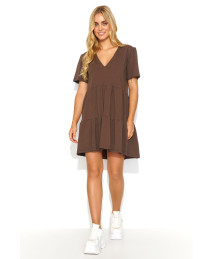 Sukienki z wiskozy są zwiewne, swobodne i nadal bardzo modne. Nasza maxi sukienka o luźnym kroju posiada przeszycia w dwóch miejscach tworząc efektowne marszczenia. Dekolt wycięty w kształcie litery „V” pięknie eksponuje biust i obojczyki. Dodatkowym atutem jest wszyta minimalistyczna pozłacana blaszka z tyłu sukienki. Ten model to doskonała propozycja casualowej stylizacji, którą możesz dopełnić sportowym obuwiem, sandałami czy botkami. Kobiety ceniące luźny styl, wygodę i ponadczasowość z pewnością pokochają tę sukienkę. Model występuje w kolorach: beżowy, czarny, czekoladowy, denim i khaki.