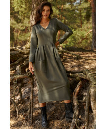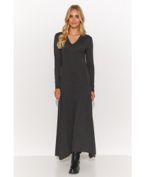 Sukienka maxi wykonana z przewiewnej dzianiny wiskozowej, jest dostępna w kolorach: grafitowy melanż, camel, cappuccino, khaki, czarny. Sukienka posiada okrągły dekolt a z tyłu ma wszytą blaszkę. Po bokach są obecne kieszenie wsuwane. Sukienka ma asymetryczne przeszycie umiejscowione lekko poniżej talii. Długi rękaw zapewnia swobodę. Rewelacyjny wybór widowiskowej stylizacji do pracy czy na wyjście z przyjaciółmi. Zwłaszcza w zestawieniu z wełnianym płaszczem.