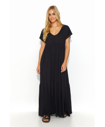 Sukienki z wiskozy są zwiewne, swobodne i nadal bardzo modne. Nasza maxi sukienka o luźnym kroju posiada przeszycia w dwóch miejscach tworząc efektowne marszczenia. Dekolt wycięty w kształcie litery „V” pięknie eksponuje biust i obojczyki. Dodatkowym atutem jest wszyta minimalistyczna pozłacana blaszka z tyłu sukienki. Ten model to doskonała propozycja casualowej stylizacji, którą możesz dopełnić sportowym obuwiem, sandałami czy botkami. Kobiety ceniące luźny styl, wygodę i ponadczasowość z pewnością pokochają tę sukienkę. Model występuje w kolorach: beżowy, czarny, czekoladowy, denim i khaki.
