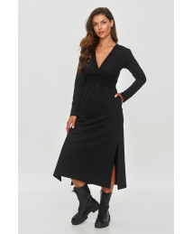 Ta sukienka jest doskonałym przykładem elegancji połączonej z wygodą. Model ma prosty, lekko dopasowany krój o długości midi, który podkreśla sylwetkę, a jednocześnie zapewnia komfort. Natomiast subtelne rozcięcie z tyłu sukienki nie krępuje ruchów. Wykonana jest z miękkiego, elastycznego materiału dresowego, który dobrze układa się na ciele, co czyni ją idealną na wiele okazji. Dekolt wykończony ściągaczem, w kształcie litery "V" dodaje sukience subtelnej elegancji i delikatnie wysmukla szyję. Długie rękawy są zakończone szerokimi ściągaczami, co nadaje całości klasyczny wygląd. Rękawy posiadają lekkie bufki przy ramionach, co dodaje sukience nowoczesnego charakteru. Dostępna w kilku wariantach kolorystycznych: czarny, czekoladowy i grafitowy melanż. Taka kreacja jest idealna na codzienne wyjścia, spotkania z przyjaciółmi, czy nawet do pracy, gdzie panuje nieformalny dress code. Ponadto model łączy w sobie klasykę z nutą nowoczesności, co sprawia, że jest wszechstronnym elementem garderoby.