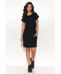 Krótka sukienka z dzianiny dresowej. Wygodna casualowa kreacja ze ściągaczem w talii. Posiada dwie boczne wsuwane kieszenie. Przy jednej z nich obecna jest urocza złota blaszka. Okrągły dekolt oraz krótki rękaw nadają sukience minimalizmu i uniwersalności. To niezwykle wdzięczna codzienna kreacja, którą możesz stylizować na wiele sposobów. Na sportowo, elegancko i biznesowo - jak lubisz. Załóż do niej tenisówki, spakuj lekki damski blezer i wybierz się ze znajomymi na zakupy lub zabierz dzieciaki na spontaniczny piknik. W każdej sytuacji ta sukienka sprawdzi się doskonale. Sukienka występuje w kolorach: pudrowy róż, śmietankowy, piaskowy, czarny, błękitny.