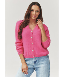 Stylowy i kobiecy sweter damski zapinany na guziki, który łączy wygodę i ponadczasową elegancję. Model wykonany z miękkiej i przyjemnej w dotyku dzianiny, zapewniającej komfort noszenia przez cały dzień. Delikatny dekolt w serek (V-neck) subtelnie podkreśla sylwetkę i optycznie wysmukla szyję. Luźny fason w rozmiarze UNI doskonale dopasowuje się do różnych typów sylwetek, oferując swobodę ruchów i modny, lekko oversize’owy efekt. Sweter świetnie sprawdzi się zarówno noszony samodzielnie, jak i jako lekka narzutka na top lub sukienkę. Model dostępny w kilku wariantach kolorystycznych co pozwala łatwo dopasować się od indywidualnego stylu oraz aktualnych trendów. Idealny do stylizacji casualowych, biurowych oraz codziennych.