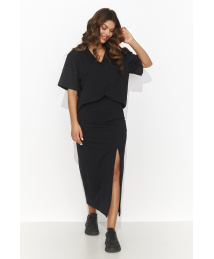 Moteriškas komplektas, spinduliuojantis elegancija ir laisvumu, susidedantis iš pieštuko formos sijono iki kelių su subtiliu skeltuku ir laisvo kirpimo marškinėlių trumpomis rankovėmis su V formos iškirpte. Dėmesį patraukianti detalė – dekoratyvinė auksinė plokštelė, esanti palaidinės nugarėlėje, suteikianti subtilios ekstravagancijos. Šis komplektas yra trijų žavingų spalvų: šviesiai smėlio, juodos ir šokolado, todėl jį galima pritaikyti įvairioms progoms ir stiliams. Pieštuko formos sijonas pabrėžia moterišką figūrą, kartu užtikrindamas patogumą, o laisvi marškinėliai suteikia lengvumo ir laisvumo. Tai idealus klasikos ir modernumo derinys, kuris neabejotinai patrauks mados mylėtojų dėmesį.