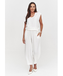 Postaw na wygodę i nowoczesny styl dzięki temu wyjątkowemu kompletowi damskiemu. Zestaw składa się z lekkiej, luźnej bluzki oraz komfortowych spodni o swobodnym kroju, które doskonale układają się na sylwetce. To idealna propozycja dla kobiet ceniących modę casualową, funkcjonalność i ponadczasowy design. Bluzka o prostym fasonie zapewnia pełną swobodę ruchów i świetnie sprawdzi się zarówno na co dzień, jak i podczas spotkań w mniej formalnym stylu. Spodnie z elastyczną talią i wiązaniem gwarantują idealne dopasowanie oraz wysoki komfort noszenia przez cały dzień. Dzięki uniwersalnemu krojowi komplet doskonale wpisuje się w aktualne trendy, tworząc stylizacje idealne na spacer, zakupy czy wyjazd.