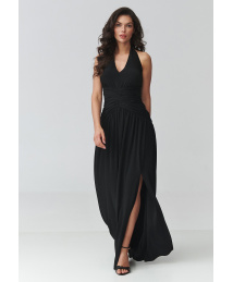 Sukienka maxi z rozcięciem i marszczeniem w talii czarna M944