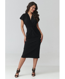Stylowa sukienka midi to doskonały wybór dla kobiet, które cenią klasyczną elegancję i nowoczesny design. Model wyróżnia się wyjątkowym krojem, który pięknie podkreśla sylwetkę i zapewnia komfort noszenia. Kobiecy dekolt w kształcie litery V subtelnie eksponuje górną część sylwetki oraz optycznie wydłuża szyję. Centralnym elementem projektu jest efektowne marszczenie w talii, które modeluje figurę i nadaje sukience eleganckiego charakteru. Delikatnie układający się materiał tworzy naturalne drapowania, dzięki czemu dopasowana sukienka midi pięknie podkreśla talię i biodra, jednocześnie zapewniając swobodę ruchów. Luźniejsze rękawy nadają całości lekkości i sprawiają, że sukienka doskonale sprawdzi się zarówno na co dzień, jak i podczas bardziej formalnych okazji. Długość do połowy łydki dodaje stylizacji klasy i sprawia, że sukienka midi elegancka jest uniwersalnym elementem kobiecej garderoby.