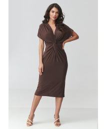 Stylowa sukienka midi to doskonały wybór dla kobiet, które cenią klasyczną elegancję i nowoczesny design. Model wyróżnia się wyjątkowym krojem, który pięknie podkreśla sylwetkę i zapewnia komfort noszenia. Kobiecy dekolt w kształcie litery V subtelnie eksponuje górną część sylwetki oraz optycznie wydłuża szyję. Centralnym elementem projektu jest efektowne marszczenie w talii, które modeluje figurę i nadaje sukience eleganckiego charakteru. Delikatnie układający się materiał tworzy naturalne drapowania, dzięki czemu dopasowana sukienka midi pięknie podkreśla talię i biodra, jednocześnie zapewniając swobodę ruchów. Luźniejsze rękawy nadają całości lekkości i sprawiają, że sukienka doskonale sprawdzi się zarówno na co dzień, jak i podczas bardziej formalnych okazji. Długość do połowy łydki dodaje stylizacji klasy i sprawia, że sukienka midi elegancka jest uniwersalnym elementem kobiecej garderoby.