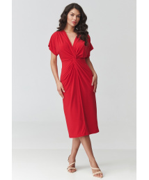 Stylowa sukienka midi to doskonały wybór dla kobiet, które cenią klasyczną elegancję i nowoczesny design. Model wyróżnia się wyjątkowym krojem, który pięknie podkreśla sylwetkę i zapewnia komfort noszenia. Kobiecy dekolt w kształcie litery V subtelnie eksponuje górną część sylwetki oraz optycznie wydłuża szyję. Centralnym elementem projektu jest efektowne marszczenie w talii, które modeluje figurę i nadaje sukience eleganckiego charakteru. Delikatnie układający się materiał tworzy naturalne drapowania, dzięki czemu dopasowana sukienka midi pięknie podkreśla talię i biodra, jednocześnie zapewniając swobodę ruchów. Luźniejsze rękawy nadają całości lekkości i sprawiają, że sukienka doskonale sprawdzi się zarówno na co dzień, jak i podczas bardziej formalnych okazji. Długość do połowy łydki dodaje stylizacji klasy i sprawia, że sukienka midi elegancka jest uniwersalnym elementem kobiecej garderoby.