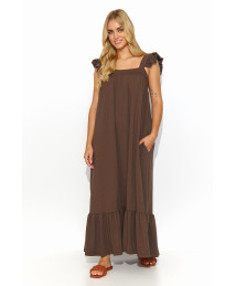 Sukienka maxi z falbanami umiejscowionymi na ramiączkach oraz w dolnej części kreacji to kwintesencja letniego stylu i swobody. Dzięki praktycznym bocznym kieszeniom wsuwanym, sukienka nie tylko wygląda stylowo, ale również jest funkcjonalna. Jej luźny fason sprawia, że jest niezwykle wygodna i nadaje się na różne okazje. Można ją nosić puszczoną luźno, stawiając na lekkość i swobodę, lub spiętą paskiem, aby podkreślić talię i nadać kreacji bardziej zdefiniowany kształt. Dostępna w różnorodnych kolorach, takich jak: mineralny, jasny beż, khaki, koralowy, czekoladowy i czarny, pozwala na dopasowanie do Twojego stylu i nastroju. Idealna na spacer po molo czy romantyczną kolację przy zachodzie słońca, ta sukienka zapewni Ci nie tylko stylowy wygląd, ale także komfort i lekkość noszenia, pozwalając cieszyć się letnimi chwilami w pełni.