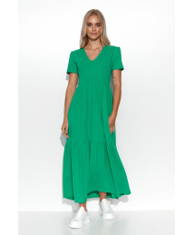 Sukienki to niewątpliwie jedne z najbardziej kobiecych części damskiej garderoby. Nic dziwnego, to właśnie one dodają powabu i dziewczęcego czaru. Sukienka maxi dzianinowa uszyta została w bardzo klasycznym fasonie, który z niemal każdej kobiety czyni klepsydrę. Wygodna dzianina zapewnia uczucie swobody, krótki rękaw zakrywa ramiona w ich najszerszych obszarach. Dekolt typu v-neck wydłuża szyję, z kolei obszycie w okolicach talii, podkreśla najszczuplejszy obszar kobiecej sylwetki, dodając lekkości. Lekkie falbany, umiejscowione w kilku miejscach na całej długości sukienki, dodadzą romantycznego charakteru każdej stylizacji z tą kreacją w roli głównej. Maxi sukienka w jednolitym kolorze nie potrzebuje wielu dodatków, chociaż także chętnie przyjmie wiele z nich. Na sportowo, z ulubioną nerką i tenisówkami lub elegancko, ze szpilkami i kopertówką. Sukienka dostępna jest w kilku wersjach kolorystycznych.
