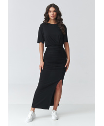 Stylowa sukienka maxi to idealne połączenie komfortu i ponadczasowej elegancji. Jej luźny, swobodny fason pięknie układa się na sylwetce, zapewniając wygodę noszenia przez cały dzień. Delikatny dekolt w kształcie litery V subtelnie podkreśla linię szyi, a odcięcie pod biustem nadaje całości lekkości i kobiecego charakteru. Długa sukienka została wykonana z przyjemnej w dotyku, oddychającej tkaniny, która sprawdzi się zarówno w cieplejsze dni, jak i w stylizacjach warstwowych. Krótkie rękawy oraz rozcięcia po bokach dodają jej nowoczesnego wyglądu i swobody ruchów. Sukienka doskonale komponuje się z dodatkami – od sportowych sneakersów po eleganckie sandały czy botki. To uniwersalna sukienka damska, która sprawdzi się na wiele okazji – do pracy, na spacer, spotkanie z przyjaciółmi czy wakacyjny wyjazd.