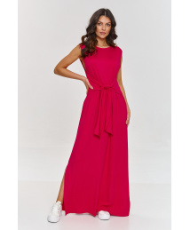 Stylowa sukienka maxi wykonana z lekkiej dzianiny wiskozowej to idealna propozycja na wiosenne i letnie dni. Charakteryzuje się luźnym krojem oraz wygodnym wiązaniem w talii, które dodaje jej kobiecości i pozwala na dopasowanie sukienki do figury, zapewniając przy tym komfort przez cały dzień. Okrągły dekolt zapewnia uniwersalność a brak rękawów sprawia, że jest to doskonała opcja na cieplejsze dni. Długość maxi dodaje jej klasy a boczne rozcięcie kokieteryjności i lekkości, jednocześnie wprowadzając dynamiczny i nowoczesny akcent do stylizacji. Sukienka ma klasyczny i minimalistyczny krój, który doskonale sprawdzi się zarówno w codziennych, jak i bardziej formalnych zestawieniach. Jest to uniwersalna opcja, która pasuje do różnych okazji. Zestaw ją ze sportowymi butami na co dzień lub eleganckimi sandałami, co uczyni ją idealnym wyborem na wypady na miasto, spacer czy weekendowy relaks. Model zaprojektowany w kilku wariantach kolorystycznych: czarny, jasny beż, khaki, malinowy.