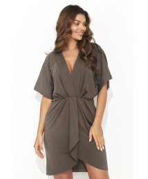 Piękna krótka sukienka typu kimono z subtelnym ściągaczem podkreślającym talię, emanująca elegancją i szykiem. Złota błyszcząca blaszka z tyłu dodaje jej subtelnego ozdobnego akcentu. Głęboki dekolt podkreśla biust, nadając sukience zmysłowego charakteru. Ta kobieca sukienka doskonale sprawdzi się zarówno w pracy, dodając szykownego wdzięku, jak i podczas eleganckiej kolacji, tworząc niezapomniany look. Dostępna w kolorach: jasny beż, khaki, ziemisty brąz, czekoladowy i czarny, pozwala na wybór odcienia, który najlepiej odzwierciedli indywidualny styl kobiety, która ją założy. To połączenie klasyki i nowoczesności, które z pewnością przyciągnie spojrzenia.