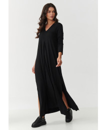 Postaw na ponadczasową klasykę i maksymalny komfort! Nasza długa sukienka maxi uszyta z wysokiej jakości wiskozy z dodatkiem elastanu to idealny wybór zarówno na co dzień, jak i na wyjątkowe okazje. Dzięki naturalnej przewiewności wiskozy oraz elastyczności tkaniny, sukienka pięknie układa się na sylwetce, nie krępując ruchów. Model posiada dekolt w literę V, który subtelnie podkreśla kobiece kształty, a lekko rozkloszowany krój z rozcięciami po bokach dodaje lekkości i nowoczesnego charakteru. Długie rękawy sprawiają, że sukienka sprawdzi się o każdej porze roku – możesz ją nosić zarówno wiosną i latem, jak i jesienią czy zimą w połączeniu z botkami lub kozakami. Dostępna w modnych kolorach: czekoladowy- głęboki, elegancki odcień, który podkreśla urodę i dodaje klasy, czarny – ponadczasowa klasyka, niezastąpiona w każdej garderobie, khaki – stylowy i uniwersalny kolor w militarnym klimacie oraz antracytowy – głęboki, ciemnoszary odcień idealny na eleganckie i casualowe stylizacje. Ta sukienka maxi to doskonały wybór dla kobiet ceniących komfort, minimalizm i elegancki styl. Świetnie wygląda zestawiona zarówno ze sportowymi sneakersami, jak i eleganckimi butami na obcasie.
